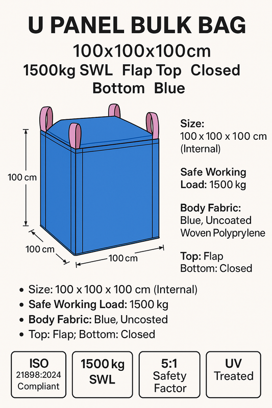 U Panel Bulk Bag 100x100x100cm, 1500kg SWL, Flap Top, Closed Bottom, Blue
